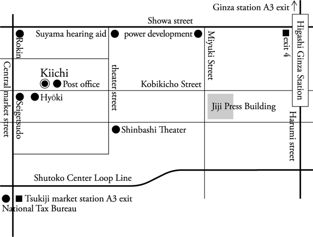 From Higashi-Ginza Station, turn onto "Showa-dori," then to "Enbujo-dori," and enter "Kobiki-cho Street." Please come using the